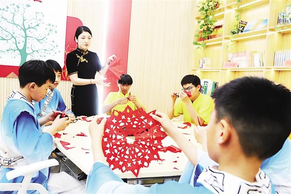 “五一”假期,周口市非物質(zhì)文化遺產(chǎn)剪紙項(xiàng)目代表性傳承人劉秀華(左三)在淮陽(yáng)伏羲公園的石榴學(xué)堂內(nèi),為學(xué)生講授剪紙知識(shí),既提高了學(xué)生的剪紙水平及欣賞能力,又豐富了他們的假日文化生活。