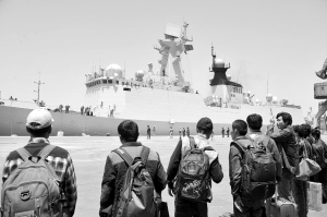 在亞丁灣、索馬里海域的中國海軍護(hù)航艦艇編隊,接到上級命令后,迅速駛向也門緊急???。劉永選說,軍艦從申請到靠岸一般要一個月時間,而這次我們只用了4天。