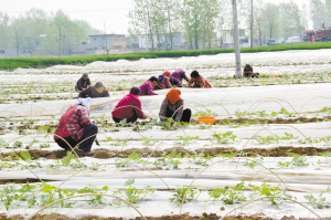 昨日,瓜農(nóng)正在為西瓜苗壓秧、修剪。在周營鄉(xiāng)趙寨村,大棚種植戶王中紅種植的溫棚覆膜西瓜,由于種植科學、品種優(yōu),所以長勢喜人,預計5月中旬就能上市。(記者 韋偉 通訊員 王祥宇 幺佳 攝)
