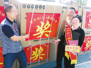 左圖 5月19日,淮陽縣隆重表彰63戶2015年度“最美家庭”。近年來,該縣依托“婦女之家”,通過召開座談會、講親情故事、曬照片等形式,大力開展尋找“最美家庭”活動,取得了良好的社會效果。圖為當(dāng)選“最美家庭”的齊國蘭高興地領(lǐng)取獎品。