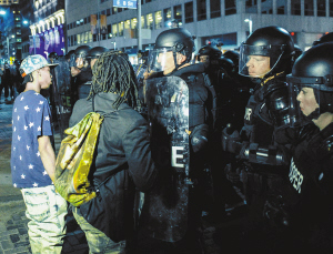 5月23日,在美國(guó)俄亥俄州克利夫蘭,兩名抗議者與警察對(duì)峙。美國(guó)俄亥俄州克利夫蘭市一名在2012年參與槍擊致死兩名未持武器的黑人而遭到刑事起訴的白人警察,23日被判無罪。此后,當(dāng)?shù)爻霈F(xiàn)抗議。