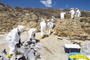 5月22日,在美國(guó)加利福尼亞州圣巴巴拉海岸邊,一隊(duì)清理人員將收集的袋裝油污傳送運(yùn)離。美國(guó)加州圣巴巴拉縣的海岸線附近19日發(fā)生嚴(yán)重管道漏油事件,泄漏的原油在雷福吉?dú)W州立海灘附近海域形成浮油帶。
