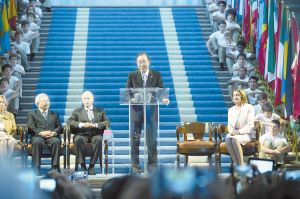 聯(lián)合國舉行《聯(lián)合國憲章》簽署70周年紀念活動 6月26日,在美國加利福尼亞州舊金山,聯(lián)合國秘書長潘基文在紀念儀式上講話。紐約聯(lián)合國總部與聯(lián)合國誕生地美國舊金山市26日同時舉行活動,紀念《聯(lián)合國憲章》簽署70周年。新華社發(fā)