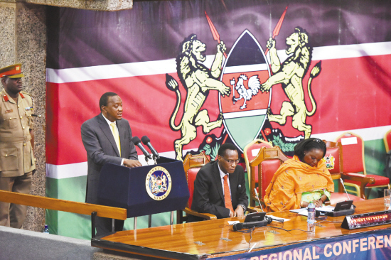 肯尼亞舉辦地區(qū)會(huì)議呼吁國(guó)際社會(huì)合作反恐   6月27日,在肯尼亞內(nèi)羅畢,肯尼亞總統(tǒng)肯雅塔(左)在地區(qū)會(huì)議上致閉幕辭。肯尼亞政府于25日至27日在首都內(nèi)羅畢舉辦地區(qū)會(huì)議,探討如何應(yīng)對(duì)暴力極端主義和恐怖活動(dòng),并呼吁國(guó)際社會(huì)合作反恐。(本欄文圖均據(jù)新華社發(fā))