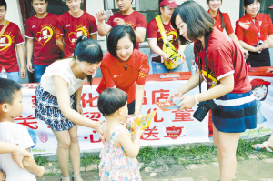 6月19日,端午節(jié)臨近之際,“美膚寶”攜手沈丘縣李玲化妝品店,來(lái)到沈丘縣豐產(chǎn)河小學(xué)開展“美膚寶陽(yáng)光計(jì)劃”公益活動(dòng),共同為200多名留守兒童捐贈(zèng)學(xué)習(xí)用品。圖為工作人員為留守兒童發(fā)放學(xué)習(xí)用品。(記者 韋偉 通訊員 王祥宇 柳珂)