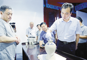 7月10日,周口市委常委、縣委書記、縣長(zhǎng)朱良才在長(zhǎng)軍博物館落戶鹿邑歡迎儀式上,觀看藏品“唐青花塔式罐”。(閆子健 攝)