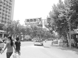 8月14日,周口市區(qū)七一路與中州大道交叉口的一處紅綠燈發(fā)生故障,工人冒著高溫酷暑及時進行搶修,確保交通安全。晚報記者 張洪濤 攝