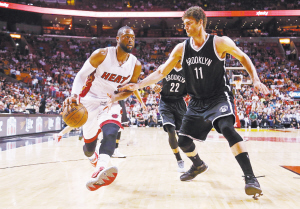 當(dāng)?shù)貢r間3月11日,熱火隊球員韋德(左)帶球突破網(wǎng)隊球員洛佩斯的防守。當(dāng)日,在2014—2015賽季NBA常規(guī)賽中,邁阿密熱火隊主場以104∶98戰(zhàn)勝布魯克林網(wǎng)隊。