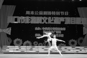 為迎接我國(guó)第十個(gè)文化遺產(chǎn)日,周口周末公益劇場(chǎng)邀請(qǐng)我市部分國(guó)家級(jí)非遺項(xiàng)目和省級(jí)非遺項(xiàng)目在周口人民會(huì)堂進(jìn)行集中展演,讓更多的周口人感受非遺項(xiàng)目的魅力?,F(xiàn)場(chǎng)展演的非遺項(xiàng)目共有8個(gè),其中有國(guó)家級(jí)非遺項(xiàng)目越調(diào)、豫劇、道情和心意六合拳,省級(jí)非遺項(xiàng)目余家雜技和漁鼓道情。
